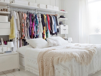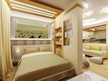 - Така че, вместо празна стена, между помещенията е инсталирана декоративна конструкция, наподобяваща прозоречна рамка, която служи и като рафт за вази. Този ход ви позволява да отделите зоната на спалнята от хола. До леглото има врата, която води към килера или гардероба. По този начин пространството остава функционално. Неговата отвореност ви позволява да поддържате усещане за простор..