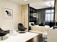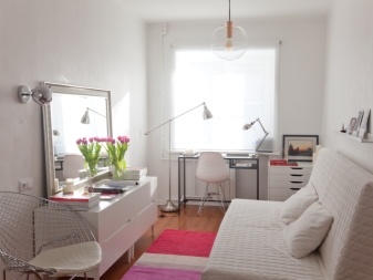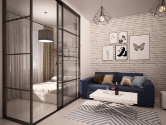 - Прозрачната плъзгаща се преграда също ви позволява да отделите една стая от друга. Ако е необходимо, тя може да бъде затворена, а когато е отворена, тя не пречи на възприемането на двете стаи като единична голяма стая и дава възможност да не се чувствате тесни. Това се улеснява от простия дизайн на тавана и мебелите без прекомерна помпозност и обемни детайли..