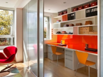 Хората, които работят от вкъщи, ще оценят проектите за преустройство на двустаен „Хрушчов“ с офис площ. В този вид версия холът например се увеличава, като се комбинира с коридора и кухнята. Това създава удобно пространство за отдих и хранене..