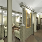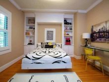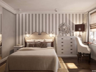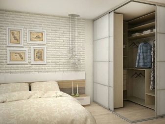 В резултат на преустройството такава спалня може дори да бъде без прозорец. Но с помощта на висококачествено осветление и други дизайнерски ощипвания, дори и в тази версия, може да се направи много уютно. Ако не се изисква значително увеличение на хола, между спалнята и залата се разрушава преграда, която се заменя с декоративни колони. В същото време зоната за спане е изолирана от любопитни очи с помощта на тежки завеси.