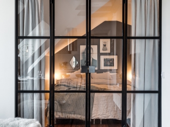 - Границата между хола и спалнята може да бъде маркирана със стъклена преграда с врата. Използването на черна рамка в дизайна прави това решение интересно, изпълвайки пространството с уют. Изглежда, че апартаментът има друг голям прозорец към пода. Така че спалнята не винаги се вижда, на преградата са предвидени завеси.