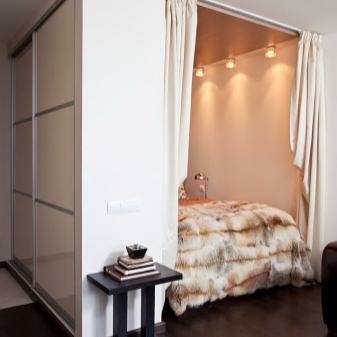 - Разпределянето на специално пространство за леглото минимизира площта на спалнята. По този начин е възможно да се освободи най -голямата част от апартамента за други функции, а собствениците имат малък уютен кът, скрит от любопитни погледи, който им позволява да се оттеглят в своя, специален интимен свят..