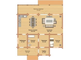 Типичен проект на едноетажна къща от дървен материал с площ 6х8 с тераса, преустроена – ако клиентът желае веранда, предполага следния план: