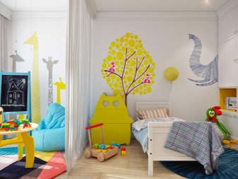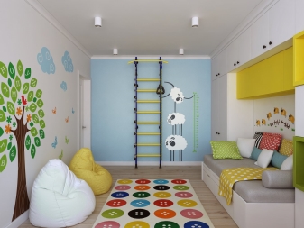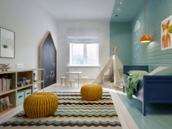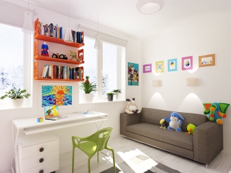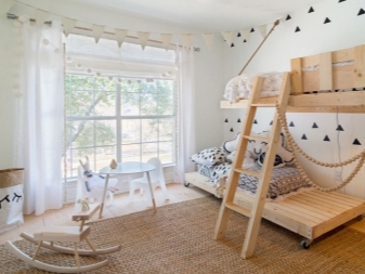Двустаен апартамент ще ви позволи да разпределите отделна стая за деца. Важно е да запомните, че за организирането на детска стая трябва да се вземат предвид допълнителни фактори: безопасност, наличие на работно място и място за игри, психоемоционален комфорт поради правилния избор на цветове и мебели. Двуетажните мебели ще спестят място за забавление. Наличието на голям брой кутии и кошници, присъщи на скандинавския стил, е най -подходящото за детските играчки.