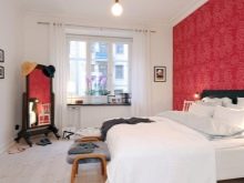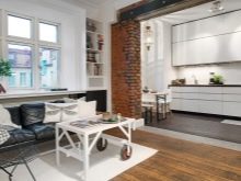 Най -добрите дизайнерски проекти демонстрират различни комбинации от материали. Това ви позволява да ограничите пространството на малък апартамент, без да инсталирате допълнителни прегради. Различни подови настилки позволяват кухнята да бъде отделена от хола. Използването на тапет върху парче измазана стена ще добави уют в спалнята. Червена тухлена стена ще се превърне в цветен акцент в бяла стая и ще напомни за връзката между скандинавския стил и таванското помещение.
