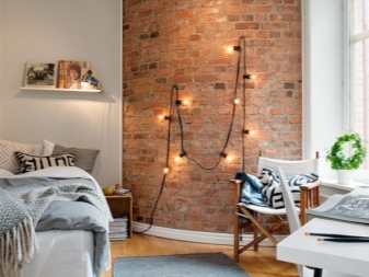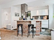 Друг вариант са плочки в кухнята и банята. Тук скандинавците използват както обикновени бели плочки без излишни украшения, така и с шарки, ярки и текстурирани. Недовършената червена тухла е често срещано явление в такива апартаменти. Това може да бъде външна носеща стена или специално направена преграда в студио апартамент. Но по -често тухлата се варосва с акрилна боя (водна емулсия).