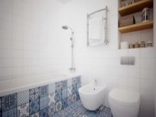 Често се избират плочки за кухнята и коридора. И ако тук може да бъде с лаконичен цвят или контрастно черно -бяло, то в банята подът много често е покрит със сини, сини плочки със стилизиран скандинавски модел..