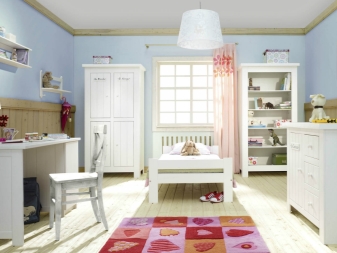 Особено внимание трябва да се обърне на пода в детската стая.. Няма смисъл да се полага скъп паркет, защото от детските шеги той скоро може да се надуе или изкриви. И в същото време подът трябва да е топъл. Може би боядисаната дървена летва е най -добрият вариант. Но не забравяйте за дебели килими и килими..