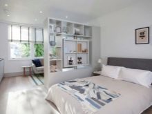 - Зонирането с отворени рафтове ще помогне за организиране на спално и работно пространство в 1-стаен апартамент.