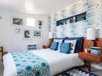 В допълнение към бялото, скандинавците много обичат да използват синьо или синьо в интериора. Близостта до морето прави този цвят естествен не само в банята, но и в спалнята. В същото време рядко срещате модели на морска тема. Присъстват по -скоро стилизирани национални орнаменти..