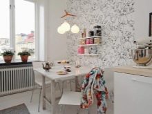- Необичайните тапети ще ви помогнат да привлечете вниманието на капризно дете и да предпазите стената от нежелани пръски. Кухнята обръща внимание на липсата на завеси и щори. Това е често срещано явление в скандинавския стил, но е малко вероятно да подхожда на жителите на първите етажи..