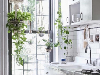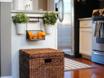- висящи кошници. За да спестите място в кухнята, е по -добре да замените растенията в саксии или прости саксии с цветя във висящи кошници. Леки саксии със специални крепежни елементи могат да бъдат фиксирани там, където няма да ви пречат, например върху плетена кошница, която все още заема място в пътеката;