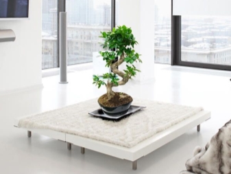 И в апартамента фикуси, миниатюрни кленове или нискорастящи иглолистни дървета ще изглеждат органично в японски стил. Можете също така да изберете изискано цвете от черешов цвят или вечнозелен бонсай. И от малки кълнове, които ще украсят рафт или маса, можете да отбележите азалии, орхидеи или закърнели хризантеми. Освен това можете да украсите дома си с малко дърво, наслаждавайки се на вкусни плодове – лимон или портокал..