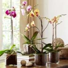 Елегантните орхидеи с тънки клони и светли цветя изглеждат добре в такъв минималистичен интериор. Освен това можете да изберете някакво необичайно цвете, например мирта, гузмания или лайвстън.
