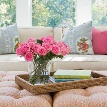 - Френска изтънченост. Ако харесвате модерен френски стил, този прост интериор също ще ви хареса. Светла всекидневна с меки розови възглавници изглежда празна, ако не използвате декоративни елементи. Но правилно подбраните цветя я съживяват. Достатъчно е да поставите три големи вани с цветя в ъгъла до прозореца и стаята ще се преобрази. И така, че различно оцветените саксии да не развалят външния вид на стаята, използвайте специални обикновени корици;