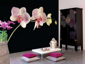 В такъв интериор детайлите също трябва да бъдат съобразени с характеристиките на вашето цвете. Например, малките възглавници вървят добре с розови листенца от орхидея. Ниска японска маса и фигурка, която я украсява, помага да се подчертае екзотичността на стила..