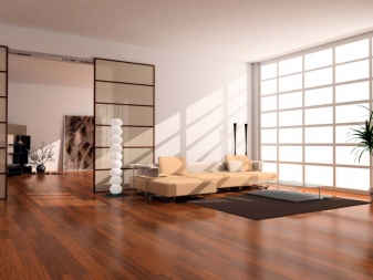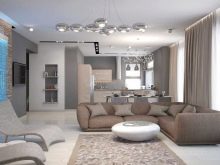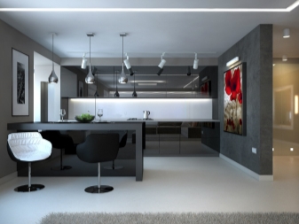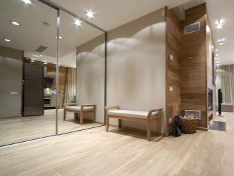 В коридора се съсредоточете върху огледалата и лъскавите настилки, задължителен атрибут е гардеробът. За кухнята изберете удължени лаконични мебели, които няма да имат остри ъгли, дръжки и други детайли. Мебелите за спалня трябва да бъдат прости и да не претрупват пространството. Отличен вариант би бил сгъваем диван или ниско легло без табла..