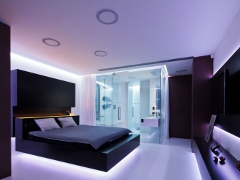 Изкуственото осветление също е необходимо във всеки интериор.. Не пестете от използването на голям брой осветителни тела. Обърнете внимание на вградените светлини, поставете ги на различни нива, за да зонирате пространството. Високотехнологичният стил използва различни LED подсветки в неутрални нюанси.