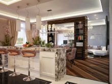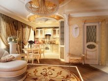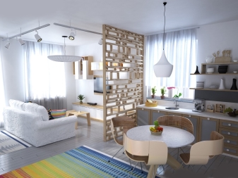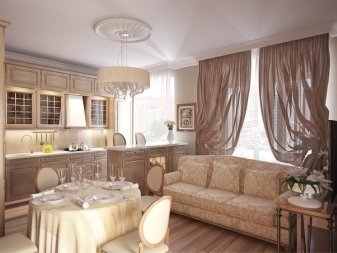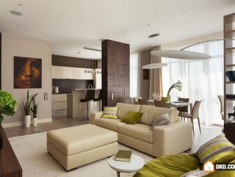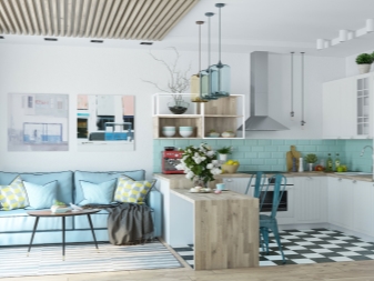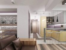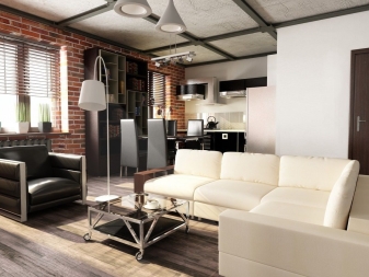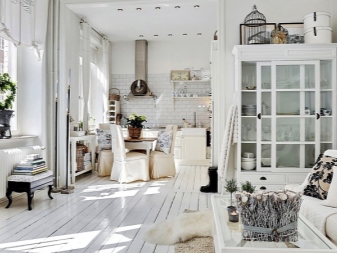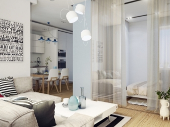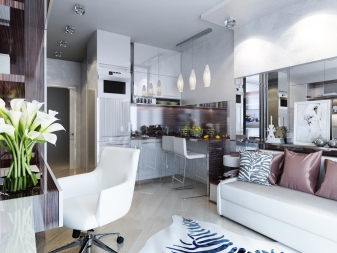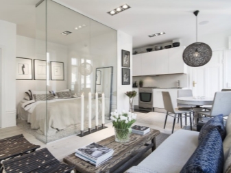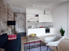 Тук преобладават светли цветове като бяло и бежово. Дизайнът е достатъчно лек за четене. Този дизайн на студио апартамент може да освежи дори мрачна стая с малко дневна светлина. И все пак, за да спасят такъв интериор от скучния и болничен вид, дизайнерите препоръчват използването на ярки акценти. Например, престилка в кухнята под формата на тухлена зидария или светъл диван.