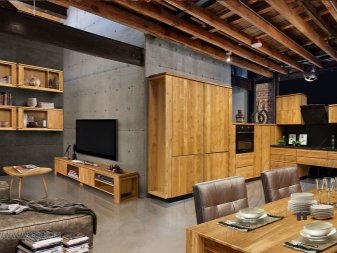 Гредите често се използват на тавана в това стилистично решение. Те могат да бъдат метални или дървесни, цветът им трябва да е същият като подовата настилка. Можете да използвате съществуващите функции на тавана или да ги изградите от гипсокартон.