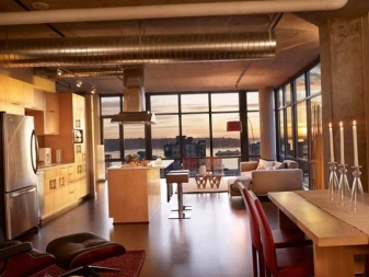 За да не изглежда такъв интериор скучен и скучен, е необходимо да добавите цветове към него. Така че ярки мебели, хладилник с нестандартен цвят или цветни възглавници ще бъдат самият акцент, който може да промени това. Големите прозорци изглеждат достатъчно добре в студиа в стил таванско помещение. Това дава добра дневна светлина, като по този начин облекчава интериора..