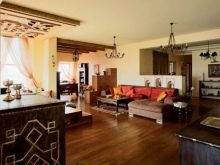 Малкото пространство, декорирано в стил Арт Нуво, включва кухня и всекидневна с разтегателен диван. Като разделяне на стаята на зони се използва бар брояч, който служи и като маса за хранене.