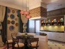 За интериора в китайски и японски стил се използва минимум мебели: подиумно легло, чифт шкафове, скрити от любопитни очи, прост кухненски комплект, плъзгащи се врати, завеси на прозорците.