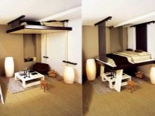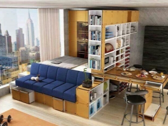 За студио апартаменти често се използват трансформиращи мебели, които комбинират няколко функции наведнъж. Една масичка за кафе лесно може да се превърне в пълноценно работно бюро или място за пиршество. Диванът се трансформира в пълноценно двойно легло, кухненският комплект се затваря с врати с плъзгаща се конструкция.