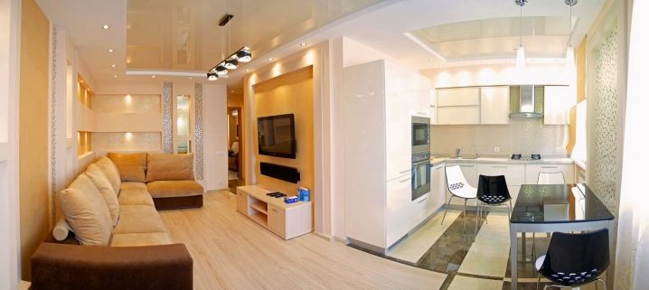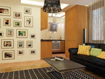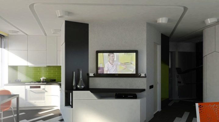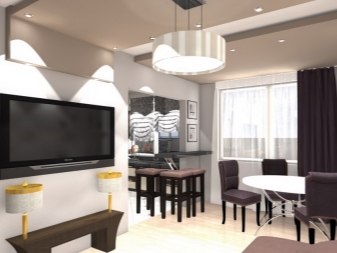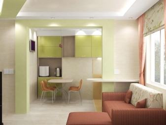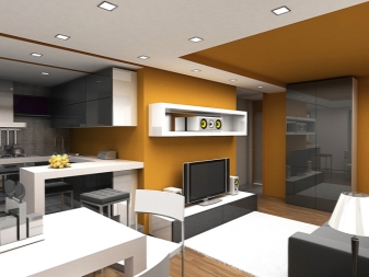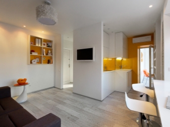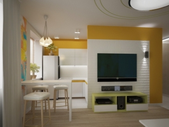 - Кухнята е комбинирана с хола. Зоната за отдих е отделена от зоната за приготвяне на храна с бар плот, който може да функционира като маса за хранене. Или използвайте различни материали или различни нюанси на подови настилки и стени.