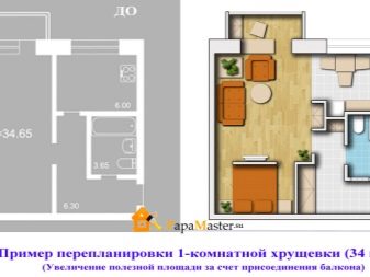 Средната площ на едностаен Хрушчов е 28-32 кв. м, докато много малка кухня на площ от 6-7 кв. м, 15-19 кв. м. Те се намират както с балкон, така и без него. Трудно е да се увеличи пространството в едностаен апартамент. Но също и 30 кв. m можете да оборудвате уютен и функционален кът за двама или трима души. Най -често в такива апартаменти: