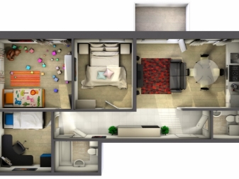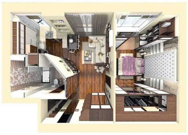 Разпространените оформления на двустайни апартаменти в ремарке са най-успешните и причиняват най-малките трудности при проектирането. Дори и без преустройство, можете функционално да подредите мебели в проходната стая и стаята забележимо ще се промени.