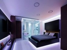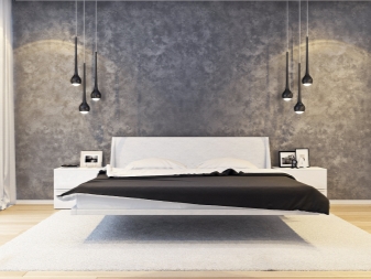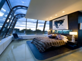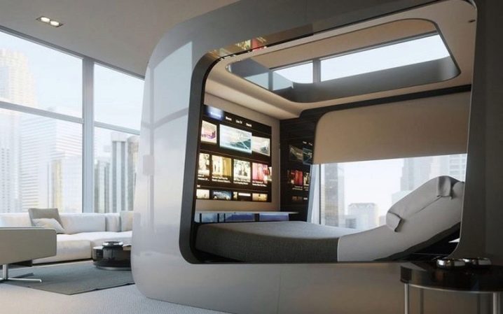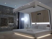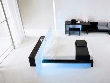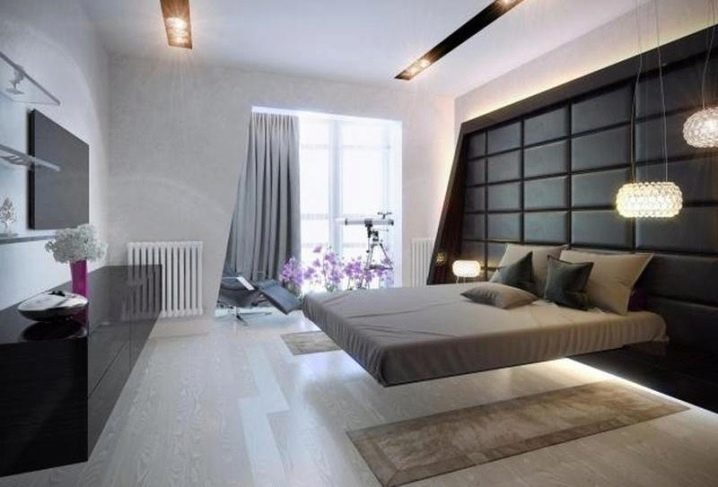 Плаващо във въздуха легло може да подчертае високите технологии в спалнята. Вградено в стената от таблата и без крака, леглото се чувства безтегловно. Такъв “космически” ефект се осигурява от допълнителното осветяване на леглото отдолу. Повърхността на стената, обшита с черна кожа, изглежда грандиозно и шокиращо.