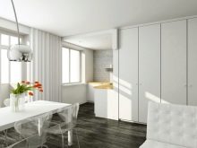 - зоната за отдих е миниатюрна, служеща само за удобно забавление: диван и масичка за кафе, които не заемат много място; обикновена тапицерия, изработена от практична износоустойчива материя или изкуствена кожа.