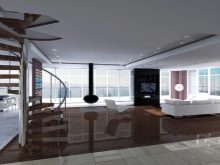 Свободното пространство на къща в тази посока го демонстрира в най -малките детайли, което означава, че качеството на довършителните материали за пода трябва да бъде най -високо, било то паркет, огледално лъскав ламинат или керамични плочки.