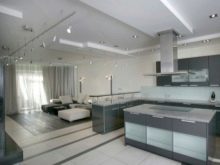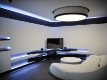 - Изобилие от светлина в стайния дизайн – характерна черта на този стил. При избора на осветителни тела се предпочитат модели с равномерни геометрични форми, които често имат авангарден вид. Оптималното решение се счита за вградени източници на светлина с енергоспестяващи свойства, те се монтират на стени и тавани, поставят се върху мебели като подсветка.