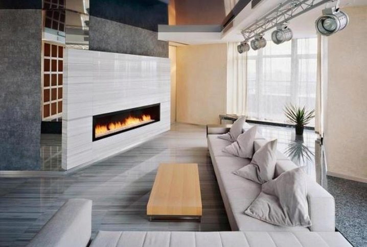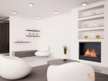 Модерен биокамин, вграден в каменна стена, може да действа като красива интериорна идея в сиво-бежова всекидневна. Лаконични светли мебели в духа на минимализма и прожектори като осветление допълват футуристичния дизайн.
