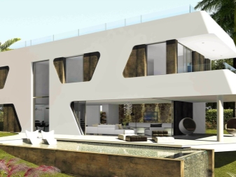 Високотехнологичната къща не е просто едноетажен или двуетажен проект. Външният вид на сградите в тази посока е променлив: структурата отвън може да изглежда като обикновен куб с плосък покрив и стъклена фасада, или може да бъде сложна многостепенна структура в духа на футуризма. Привидната външна дисхармония винаги се компенсира от вътрешната функционалност и лаконичността на интериора..