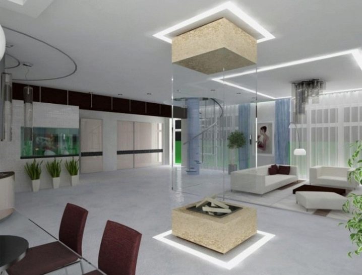 Камината може да бъде разположена и в центъра на стаята под стъклен купол, заобиколен от скрито осветление. Когато локалното осветление е изключено, то ще се превърне в основната украса на интериора..