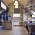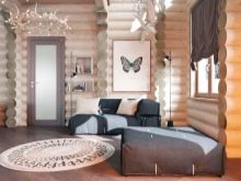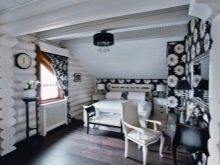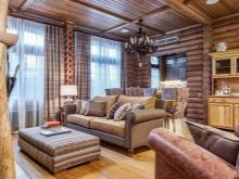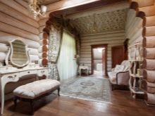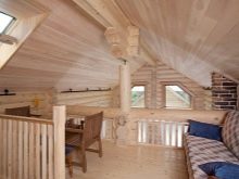 Няма ограничения за довършването на пода, желателно е довършителният материал да бъде естествен (или висококачествена имитация). Таванът може да бъде оставен дървен, или можете да измажете или украсите с греди, всички опции имат право на живот.