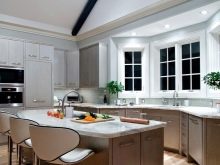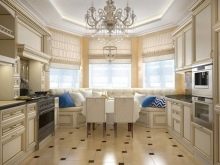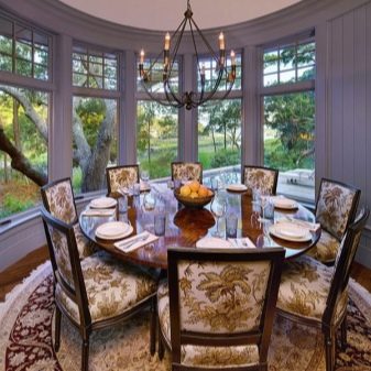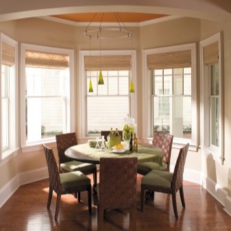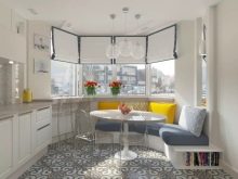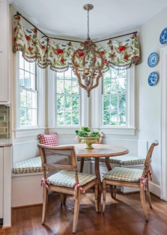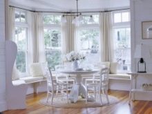 Както бе отбелязано по -горе, еркерът перфектно разделя кухнята на работна и трапезария.. В същото време нишата може да побере както маса за хранене, така и кухненски комплект със затворени шкафове, мивка и печка. Ако еркерът е много малък, можете да организирате място в него за тесен винен шкаф или минибар..