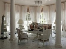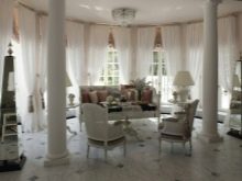 Този стил се характеризира с изобилие от бели, лимонови, розови и ментови цветове, както и фини летящи форми.. Изискани огънати крака на столове и маса, куки на ефирна органза или дълги завеси с флорален модел, изобилие от живи растения и кристал. Ако подът или отдалечеността на къщата позволяват, можете да украсите прозорците с къси френски завеси, които ще подчертаят размера на панорамните прозорци, което ви позволява да се възхищавате на гледките без препятствия.