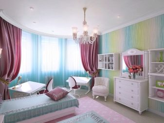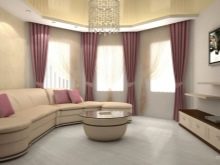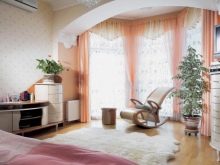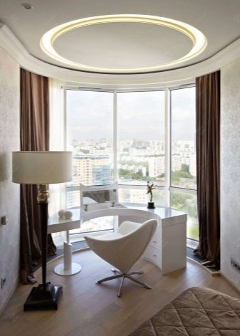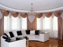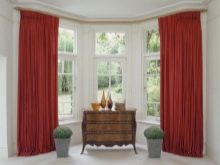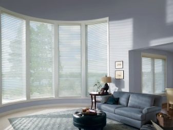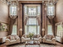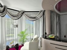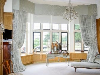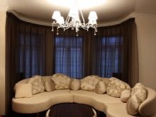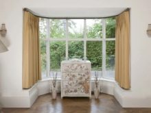 В допълнение към таваните, формата на еркера, като правило, е полукръгла, също пречи на поставянето на завеси. В този случай, ако средствата позволяват, е по -добре да закупите извити продукти по поръчка. В случаите, когато спестяванията са по -важни, можете да монтирате индиректен корниз от няколко малки, като ги прикрепите към отделни участъци от стените. Някои видове завеси не изискват инсталирането на специален корниз за тях, а също така ще изглеждат страхотно на високи прозорци на еркера.