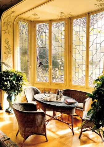 Еркерите, декорирани в народен стил, изглеждат необичайни, но не по -малко достойни.. Изобилието от естествени материали, характерни шарки и живи растения ще даде възможност да се разнообрази интериора дори на най -малката зала, без да се претоварва с масивни мебели..