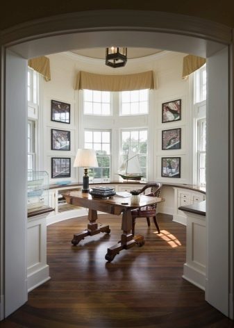 Ниша с добра естествена светлина е чудесно място за организиране на дамски кът. Малка тоалетка и мек пуф ще се поберат идеално дори на един квадратен метър. Домашният офис може да бъде подреден в по -голям еркер.