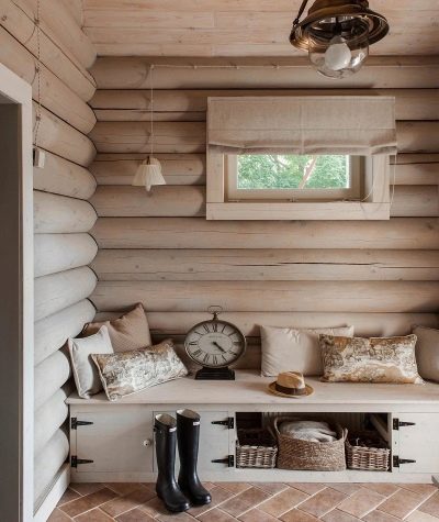 - Леките трупи, импрегнирани с антисептични и други защитни разтвори, изглеждат много красиви сами по себе си и освен това визуално разширяват пространството. Картината се допълва от подплата от същия нюанс на тавана и плочки на пода, изложени с „рибена кост“.