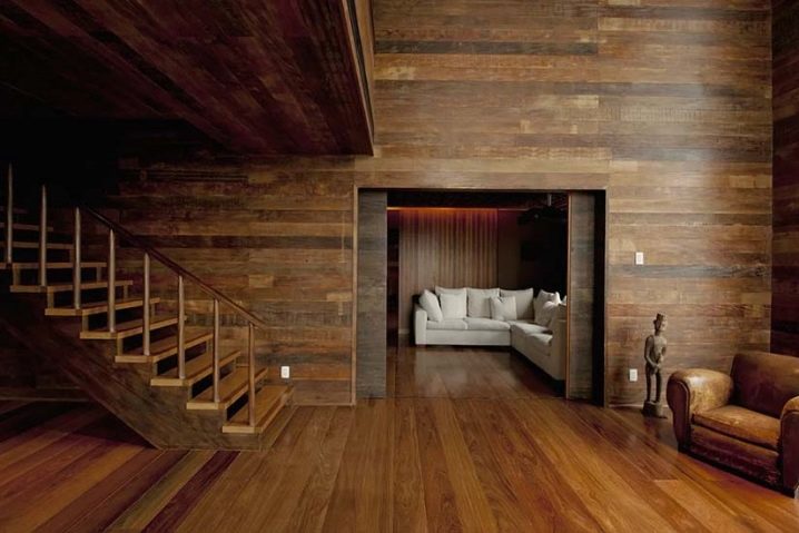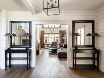 Доста често собствениците на дървени къщи решават да ги украсят с дъска. Този материал се сглобява бързо и лесно, така че всички довършителни работи могат да се извършват на ръка. Подреждането на стаи с такива панели прави пространството естетически приятно, но не вреди сериозно на бюджета. Също така си струва да се спомене, че хастарът е екологично чист и е представен на пазара в различни нюанси и дизайн. Недостатъците на този метод включват само предварителното изграждане на стружката, шлайфане и изсушаване на ламелите, както и необходимостта от грижи за покритието. След монтажа облицовката се шлайфа и отново лакира.