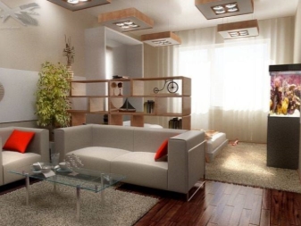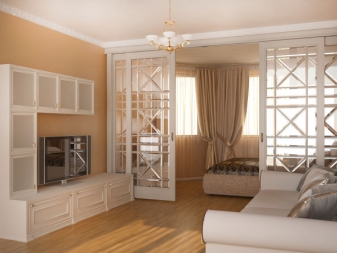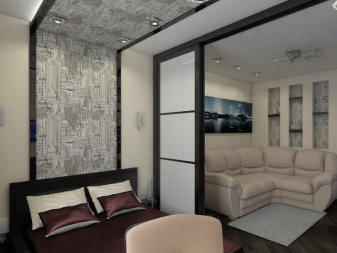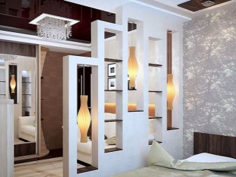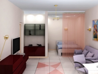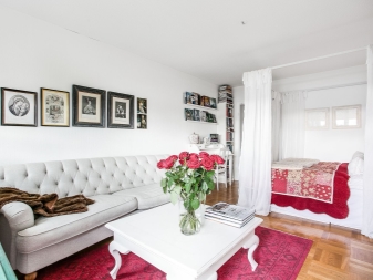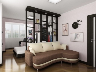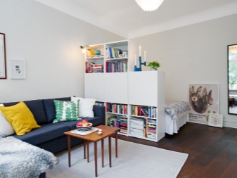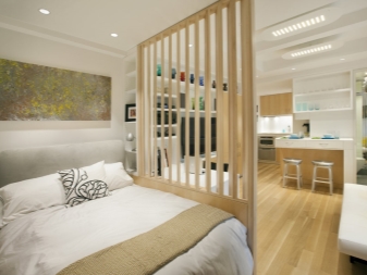 По -ясно разделяне на апартамента на две отделни зони може да се направи с помощта на удобни прегради. Има много различни опции за такива дялове. Някои от тях са по -високи, други, напротив, не са по -високи от диван или маса..