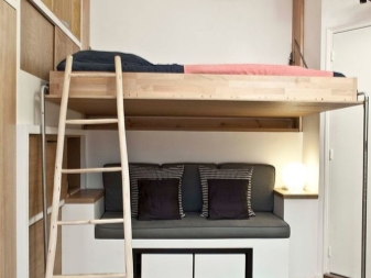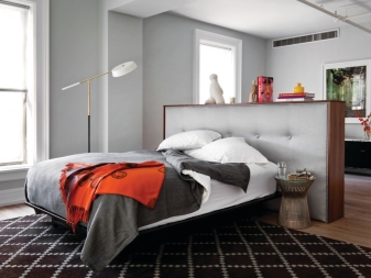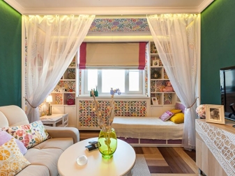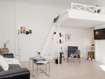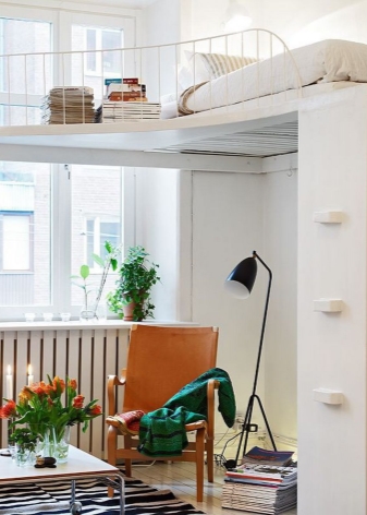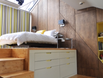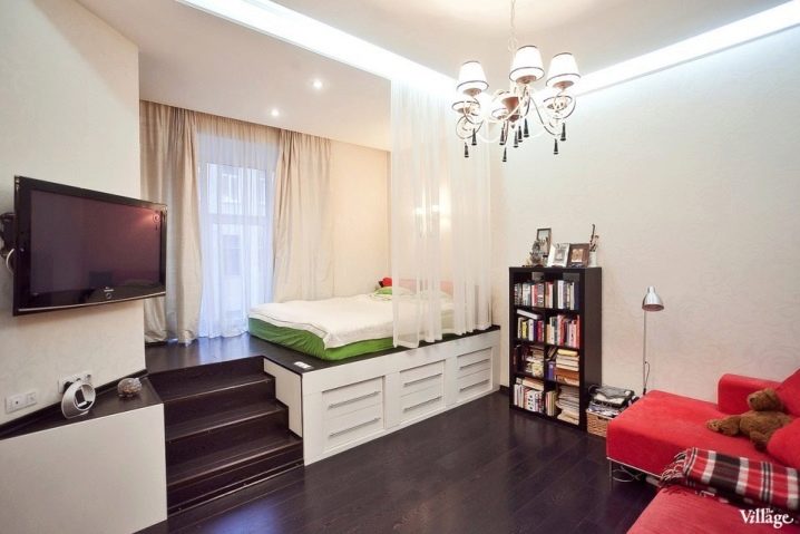 В този случай спалнята е отделена от основното пространство не само от лека полупрозрачна завеса. Леглото е поставено на специална платформа. Вътре в тази кота има шкафчета, където можете да съхранявате спално бельо и други неща. Самото легло се намира до прозореца, което също е много практично. По този начин получавате много естествена светлина. Най -добре е да изберете чисти малки аплици от изкуствени източници на светлина..