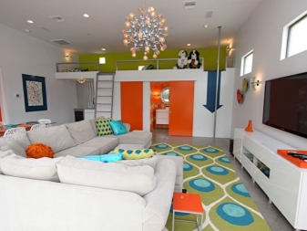 Ако не харесвате обикновени класически стаи с френски прозорец, тогава обикновен сдържан интериор може да бъде разреден с ярки цветове. В тази стая спокоен фон се комбинира с ярки акценти, което е от полза само за стаята. Стаята е разделена на две основни зони. Един от тях може да се нарече спалня, а вторият – хол..
