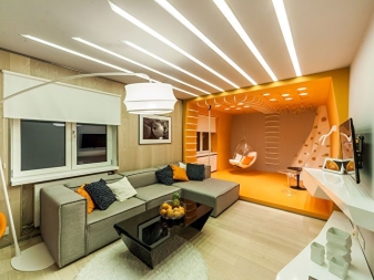 Втората зона е място, което може да се използва както като хол, така и като спалня на родител. Ъгловият диван се разгъва лесно. Но през деня този дизайн не заема твърде много място. Тази зона има собствен полилей, както и перваза на прозореца, който при необходимост може да се преобразува в допълнително работно място. Висящите шкафове са разположени над дивана, а вместо екран има удобна стойка, където можете също да подредите книги и фигурки.